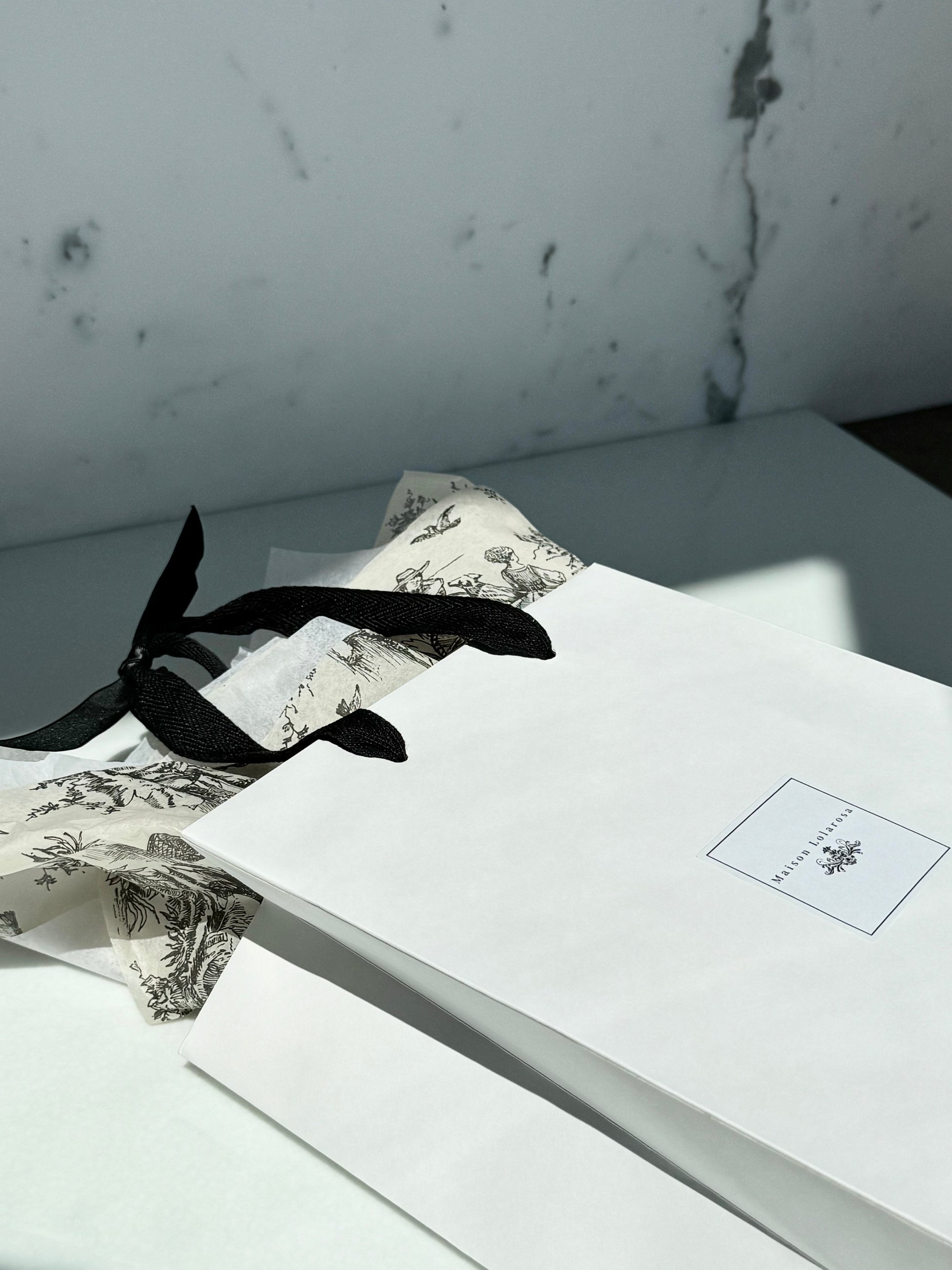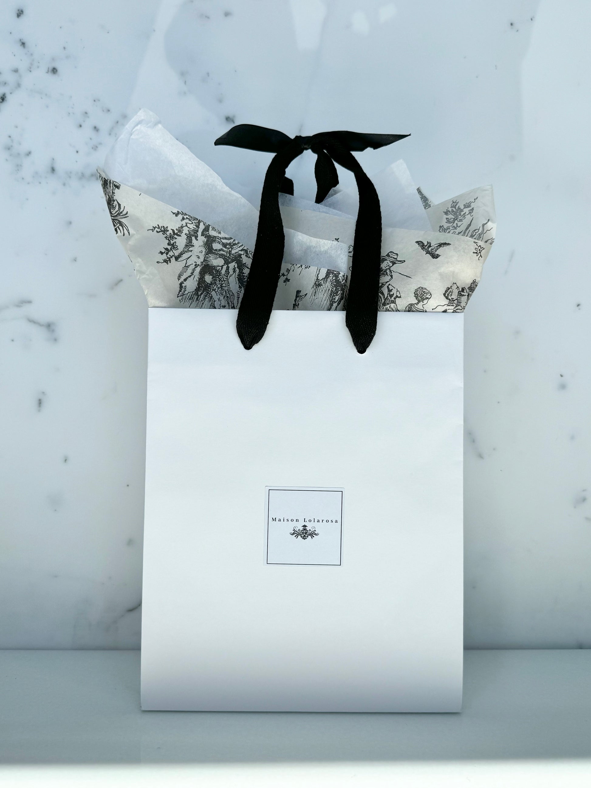 High quality white bag and black cotton twill handle with Toile de Jouy tissue paper.